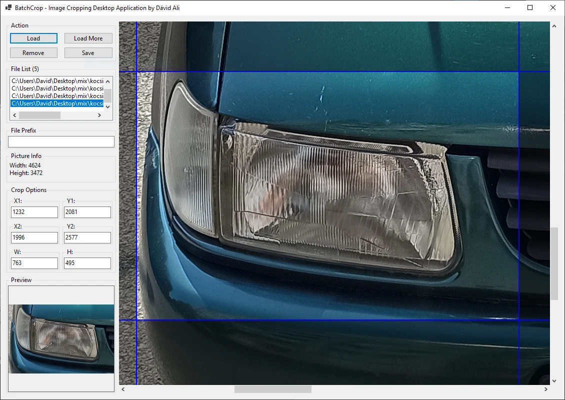 BatchCrop is a C# desktop application designed to streamline the process of cropping multiple images. It allows users to select multiple photos, define a cropping rectangle on a model image, and apply the same crop area to all selected images. The application features a preview of the cropped area and provides options to save the cropped images in JPEG format to a specified output folder. Key functionalities include interactive cropping rectangle adjustments, manual coordinate inputs, and automatic handling of file name conflicts in the output directory.